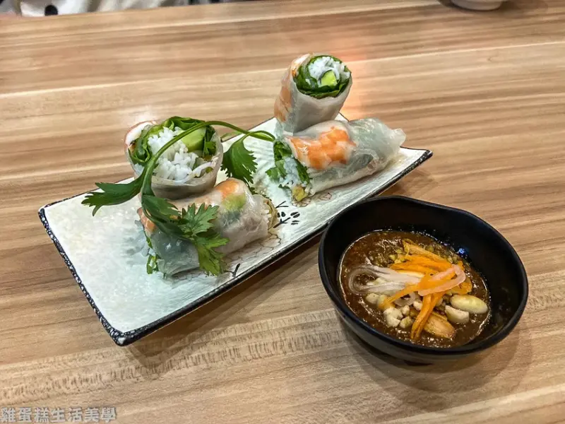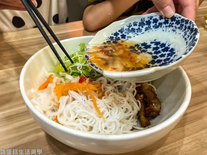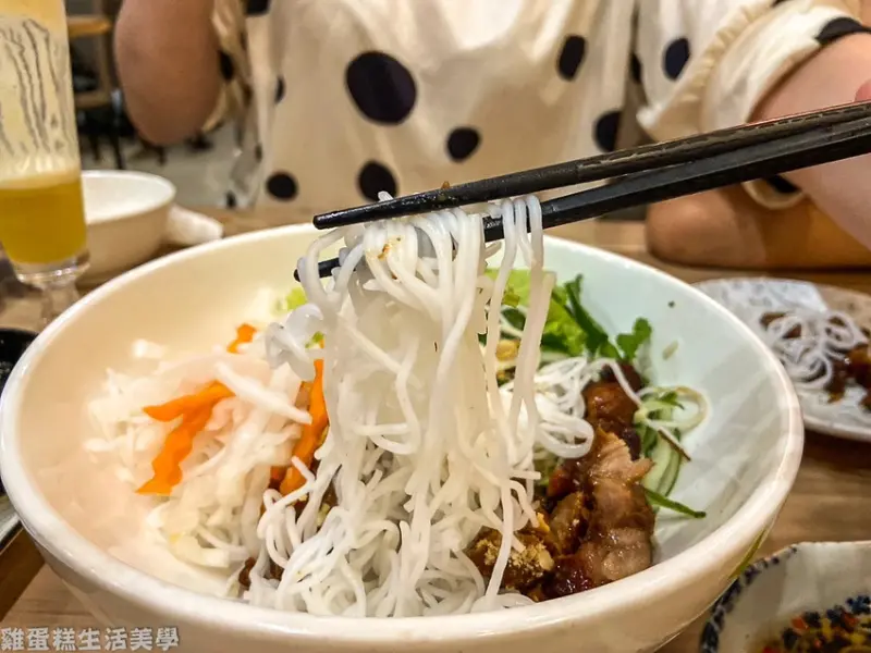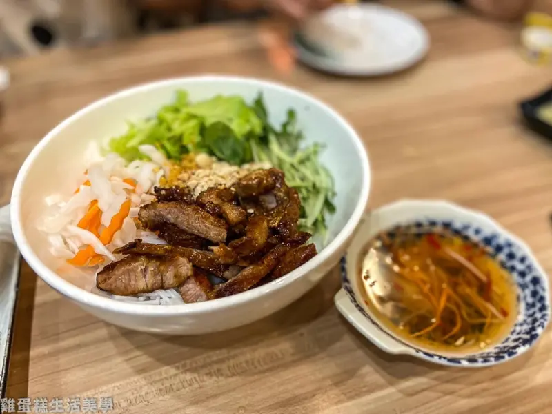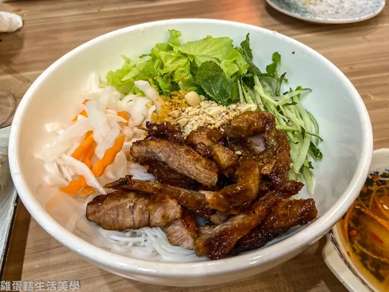 若想來點清爽無負擔的前菜,越式春捲是許多人的首選,一份春捲會被切成4段,內層裹滿了生菜、米線、小黃瓜、豆芽菜以及新鮮的鮮蝦,吃起來極為爽口。如果覺得味道太過清淡,可以沾取一旁附贈的沾醬來增添風味。越式烤肉麵線也是人氣必點的品項之一,這道料理會附上一小碟魚露,建議要將魚露全部倒入麵線中,這樣才能大大提升整體的鮮甜滋味。米線的Q度十足,配上爽口的小黃瓜和生菜,再搭配口感極為入味的烤肉,整體香氣層次豐富,讓人一口接一口。