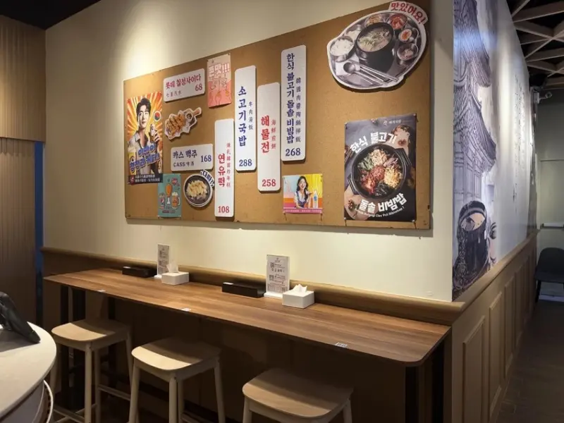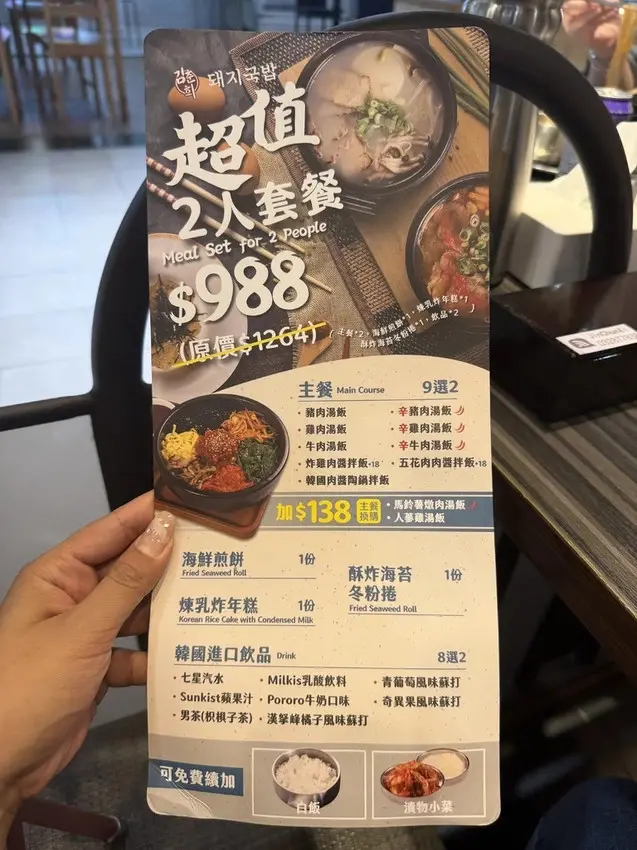 金春喜韓廚 A19 店位於桃園棒球場旁邊的環球購物中心三樓。整間餐廳以溫暖的木質調搭配柔和燈光,呈現出韓式簡約風格。座位區設計得很寬敞舒適,不論是兩人約會、家庭聚餐或朋友聚會,空間都不會讓人感到擁擠。金春喜韓廚的主打是湯飯系列,菜單提供了多種消費方式,讓不論是一人用餐或多人聚會都能輕鬆點餐。客人可以選擇單點、雙人套餐或是四人套餐,菜色搭配非常彈性,想吃湯飯、煎餅或炸雞都能自由組合。店內提供了白飯與韓式小菜無限續加的服務,整體價位親民且份量實在。店內的低消為每人 268 元,並會額外收取 10% 服務費。如果持有環球中信聯名卡或是使用 GM pay,還有九折優惠,冠德住戶也有用餐優惠。