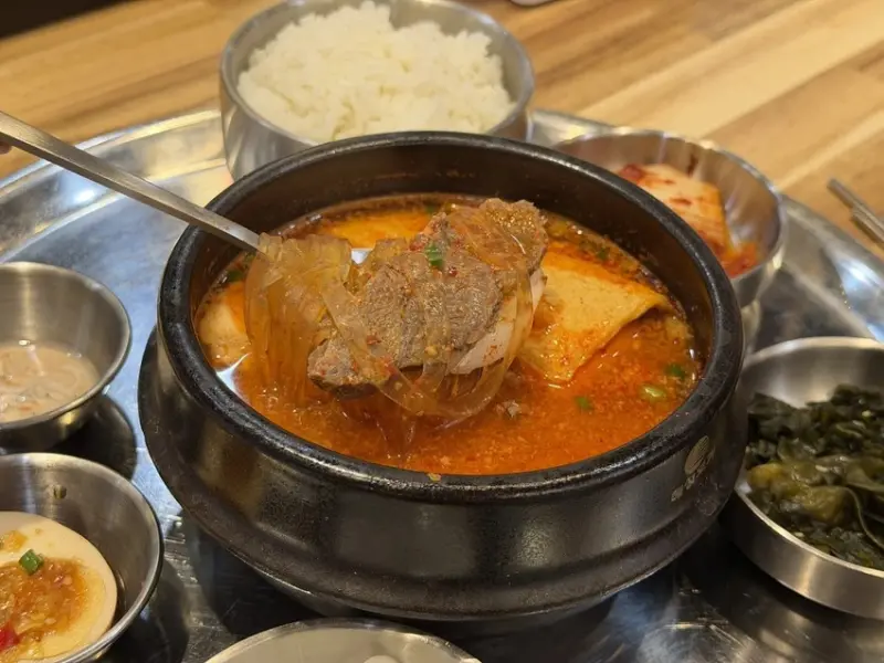 辛牛肉湯飯則是用大骨慢熬出來的湯頭,喝第一口就有豐富的層次感。牛肉片吸滿湯汁,吃起來軟嫩不柴,讓人一口下肚整個人都被暖透。