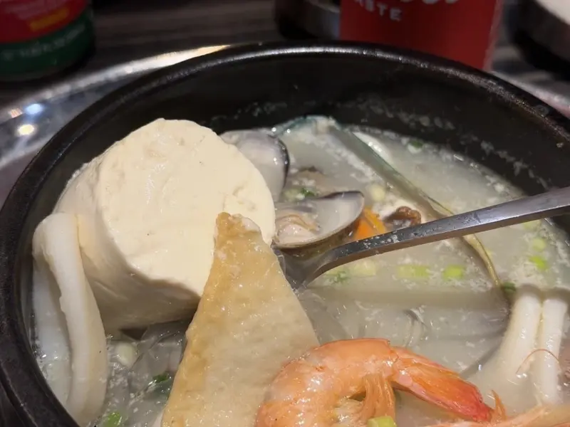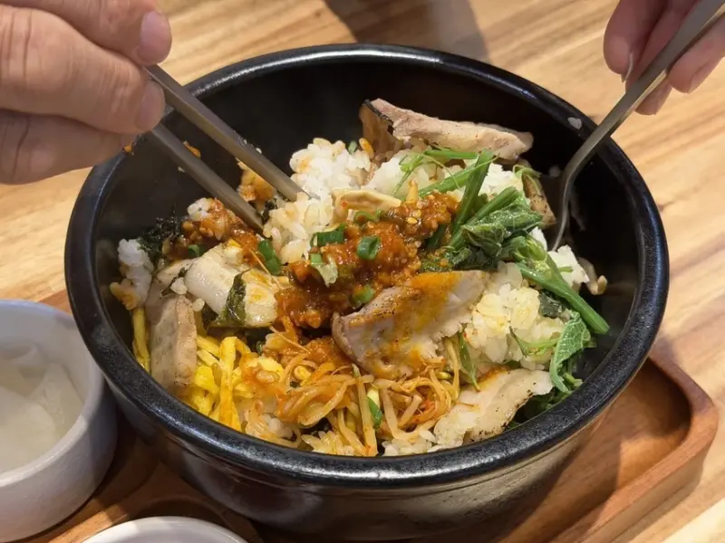 如果是不喜歡湯湯水水的人,非常推薦「五花肉肉醬陶鍋拌飯」。這道拌飯上桌時還滋滋作響,鍋巴香氣立刻撲鼻而來。拌飯時可以先決定是否要加入旁邊那碟辣醬。如果不加辣,可以吃到米飯與五花肉本身的油香;如果加進去,則瞬間變成濃郁版的韓式靈魂拌飯。五花肉的油花豐富,香氣完全融進飯粒裡,每一口都充滿滿足感。