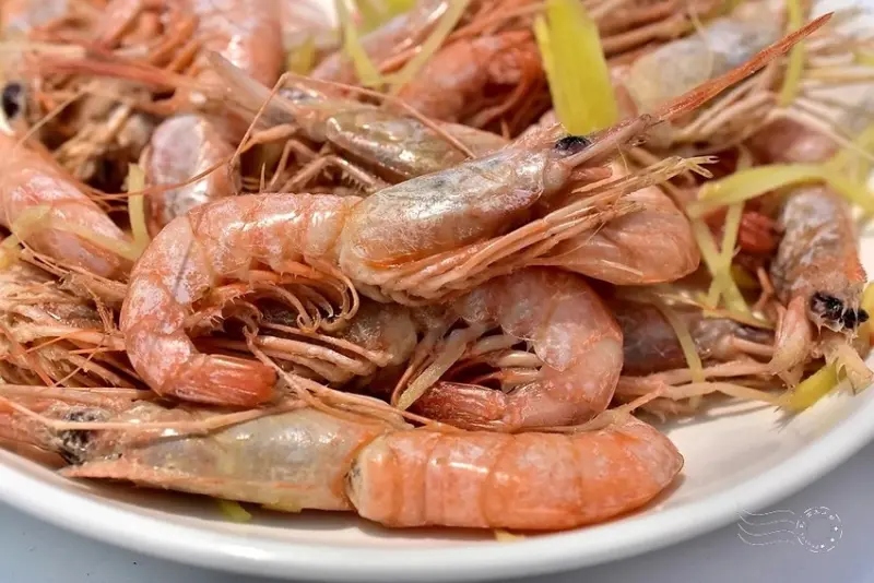 在正濱漁港最吸引人的門面,非「天聖525酒食館」莫屬。這次非常幸運地在中午時分還有位子。店內的裝潢走藍白色的希臘風格,氣氛溫馨又帶有一點可愛的情調。這間店有趣的地方是建築的高低落差,正濱漁港這側的正門進入餐廳後,上到二樓才發現,通往中正路的那扇門竟然也是一樓,讓人有一種莫名的空間錯位感。二樓有比較寬敞的雙人座位,目光馬上會被一隻超大的銀色曼波魚飾品吸引住,這隻魚太可愛了,非常喜歡。我們這次沒有選擇天聖525酒食館主打的各式下酒海鮮炸物,而是直接點了一份1100元的雙人套餐,包含「北大頭甜蝦」、櫻花蝦炒高麗菜,主食則是一份牛肉丼和一份豬肉丼。