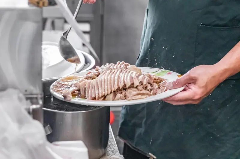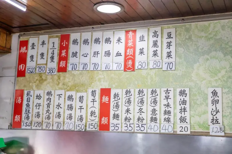 料理區設在前門,可以看到第二代老闆剁鵝肉的手幾乎沒有停過。老闆會將切好的鵝肉切盤後,再淋上鵝高湯,增添風味。店內主要販售鵝肉料理,鵝肉有四分之一隻、半隻、以及一隻的選擇。如果同行人數較多,建議可以點半隻,因為他們的份量通常非常多。如果只有兩個人,點四分之一隻就很足夠,以免吃不完。