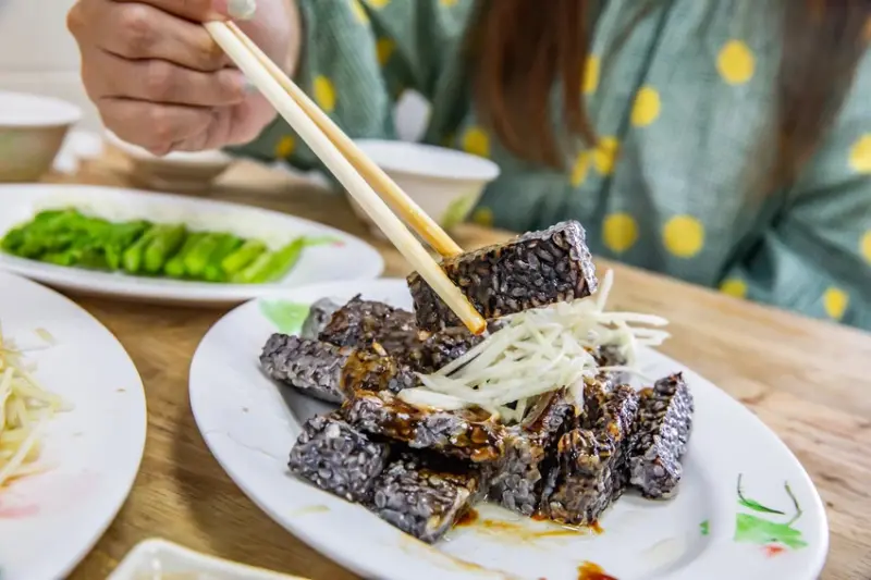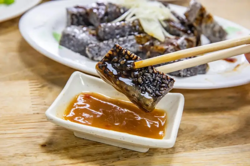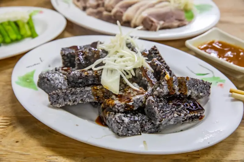 鵝米血也是人氣小菜之一。鵝米血的口感軟Q好吃。它是用鵝高湯煮的,因此帶有鮮甜的高湯香氣與鹹味。鵝米血可以直接沾醬享用,還能吃到QQ的米粒口感。