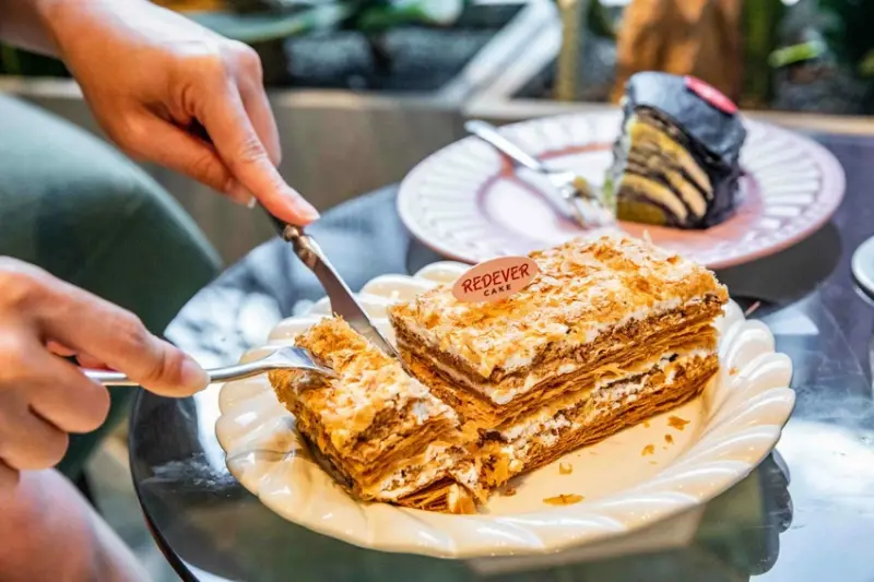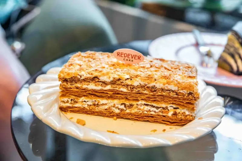「拿破崙派」則被譽為伴手禮熱銷的王者。一般的拿破崙派很容易吃起來感到奶膩,但常紅蛋糕的完全不會。拿破崙派的千層酥皮薄脆分明,一咬下去發出「喀嚓」的聲音。夾層的奶油滑順不膩,咀嚼時還能吃到核桃顆粒,增添了堅果香與微脆的口感。整體的甜度收得剛好,讓人越吃越涮嘴,店家也貼心地提供了分切服務。