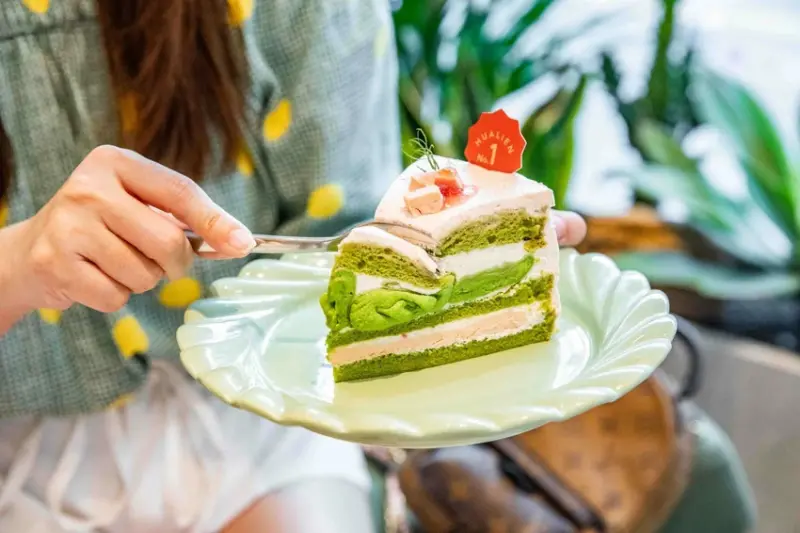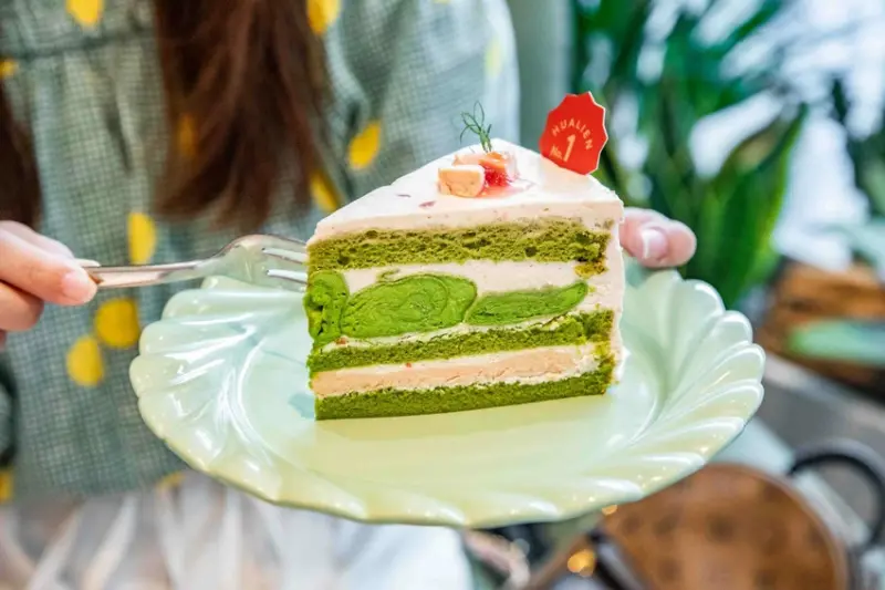 常紅蛋糕也提供了許多充滿創意的甜點組合。例如「抹茶芭樂蛋糕」,外表看起來像是一般的抹茶蛋糕,但咬下去竟然吃得到芭樂果泥。這個原本看似怪異的組合,結果卻超合拍。抹茶走的是甘韻的路線,搭配微酸甜的芭樂泥,讓蛋糕的層次感直接拉滿。蛋糕體濕潤又柔軟,奶霜清爽不膩,芭樂則帶出了清香和水潤感。