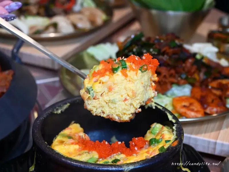 水嫩嫩的爆炸蒸蛋,口感滑順,蛋香四溢,裡頭還添加了滿滿飛魚卵及蔥花增添口感,提醒大家陶鍋會持續加熱,建議一上桌就趕緊食用,以免底部焦掉