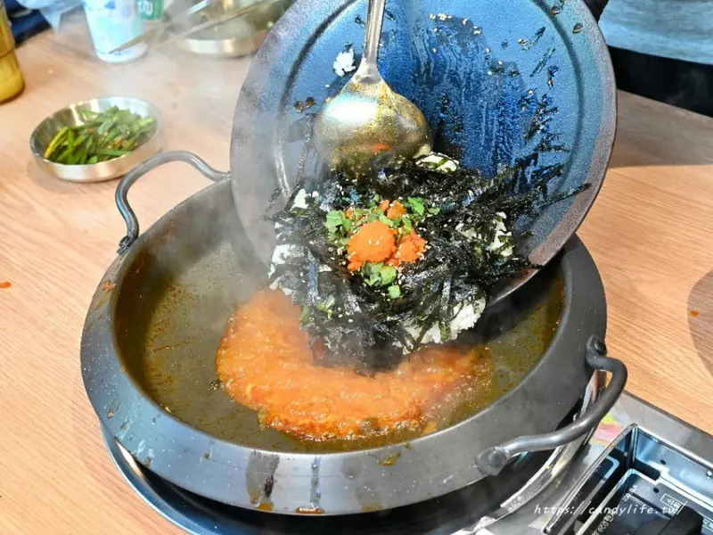 吃完馬鈴薯排骨鍋,後頭還藏著驚喜!主要點煮鍋加兩道餐點,店家就會免費贈送韓式飛魚卵炒飯,採桌邊服務,先將料及些許湯汁撈起後,加入白飯、海苔絲、麻油及飛魚卵下去炒製,香氣超迷人