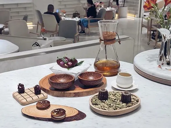 結束了 12 道餐點,顧客會被引導至進門處的沙發區域享用茶點。這裡的茶點 Petit Four 份量驚人,幾乎佔據了一整桌,體現了主廚將歐陸料理技法帶入亞洲精神,就像大家愛說的「有一種餓叫阿嬤怕你餓」。茶點內容包括冰鎮紅酒蜜梨、紫蘇紅豆牛奶糖、招牌綠豆蔻可麗露與蘋果酥餅等。茶點後搭配的無咖啡因花草茶,有薄荷、杭菊、香蜂草,幫助用餐者舒緩。