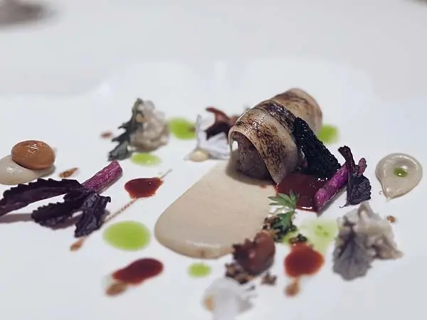 另一道讓評論者極為驚艷的料理是煙燻鴕鳥肉,吃法發想於開放式三明治。侍者打開蓋子時,一股蘋果木燻香氣飄出,裡頭是來自彰化養殖的鴕鳥腿肉,模擬海苔捲的樣子,底下搭配了紅心菇、醋漬紫高麗菜、甜菜根與覆盆莓。將這些食材攪拌成紅沙拉,抹在烤脆的裸麥麵包上,鴕鳥肉燻香與紅心菇燒炙過的木燻香氣融合,冷盤卻充滿了煙火翻騰的畫面感,被譽為當日菜單的第一名。