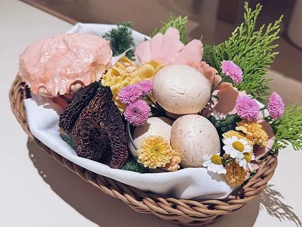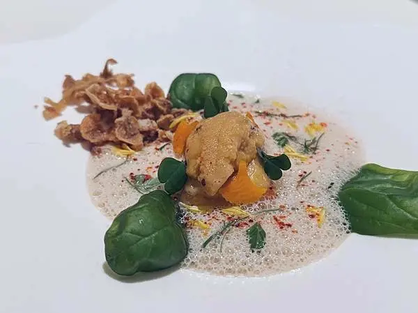 本次菜單的主軸聚焦在各式菇類,繽紛的菇類不僅有不同的香氣,也帶來了豐富的顏色,符合主廚對季節色彩帶上餐桌的要求。例如一道松葉蟹沙拉,搭配了燕窩製成的醋凍,並以芥末子冰淇淋取代法式料理常用的濃郁雷姆拉德醬汁 Remoulade。冰涼的口感讓蟹肉的鹹鮮在醋凍點綴下更加突出,口感輕盈。