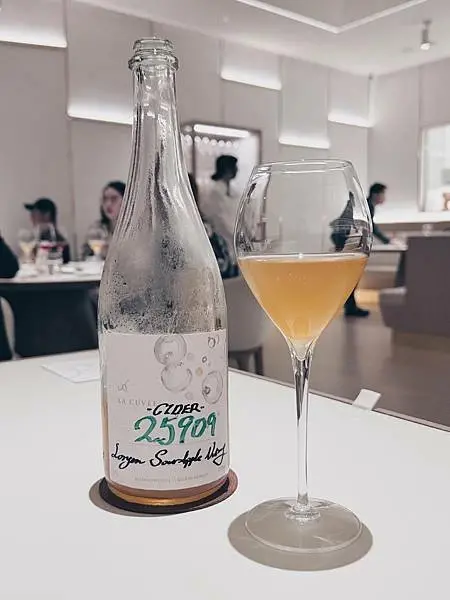 主廚黃以倫的料理核心在於「旬味與養生」,並強調創造餐點與土地的連結。本次秋季菜單即是以秋天宜食的禽類與味濃肉肥厚的蕈菇類為主軸,帶入大地收成的溫暖色調。餐廳的餐費包含了飲品搭配 Pairing,顧客可以選擇有酒精或無酒精的五杯飲品。無酒精飲品 Mocktail 的搭配非常獨到,例如第一杯清爽的蘋果酒 Apple Cider,就用龍眼木、酸蘋果與肉豆蔻調製而成,搭配五道開胃小點,開啟了鹹甜酸苦辣鮮的味覺探索之旅。