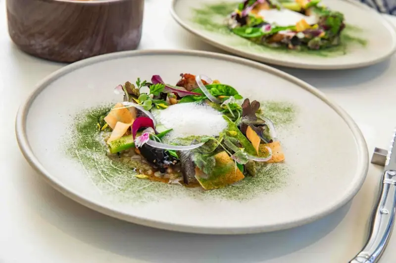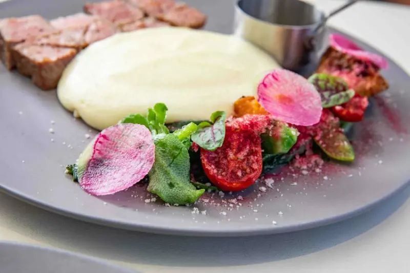 另一道主餐是「伊比利豬肋眼蓋肉」。伊比利豬肋眼蓋的嫩度細緻,油花分布像大理石般均勻。熱鍋快煎到五至七分熟最迷人,外層微酥、中心仍保持多汁彈性。搭配的綠胡椒醬清雅,將甜味拉得更立體,胡椒的辛辣在舌面微爆,辣不嗆、收尾帶有草本清涼。配菜有當季蔬菜輪番上陣,如油封南瓜的香甜、黃酒燴高麗菜苗的溫潤,還有風乾小番茄與清脆的冰花,每一口都不捨得放過。