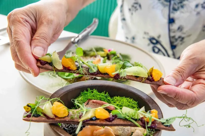 「森林的漿果」一上桌也是仙氣縹緲。主廚將肉桂餅乾抹上墨魚醬,細細點綴絲葡萄、紅醋栗、柳丁與酸黃瓜。海味的鹹鮮遇上香料的暖意,酸甜清爽將層次一路拉開,酥、脆、濕潤與果酸輪番登場,讓人越吃越上癮。