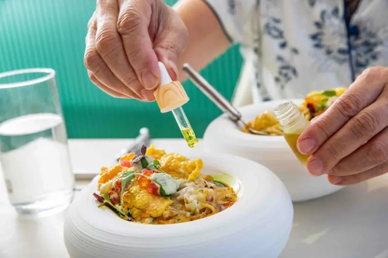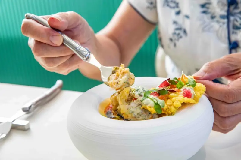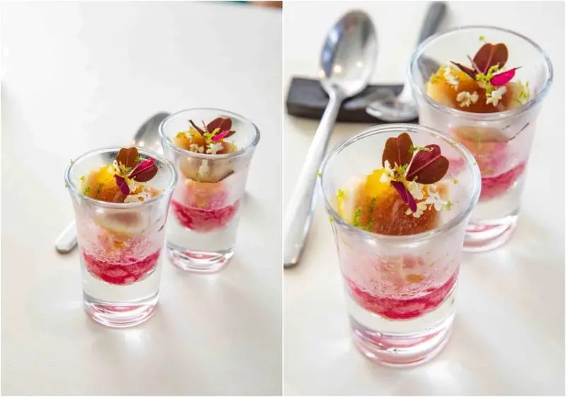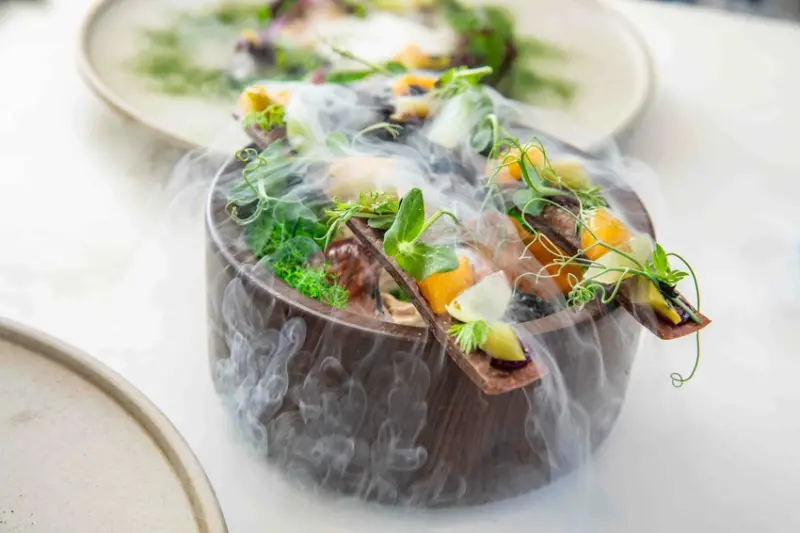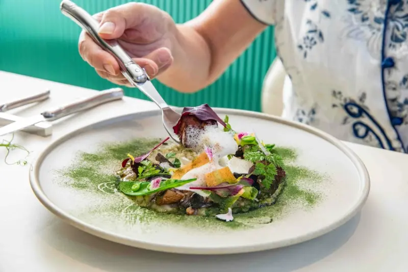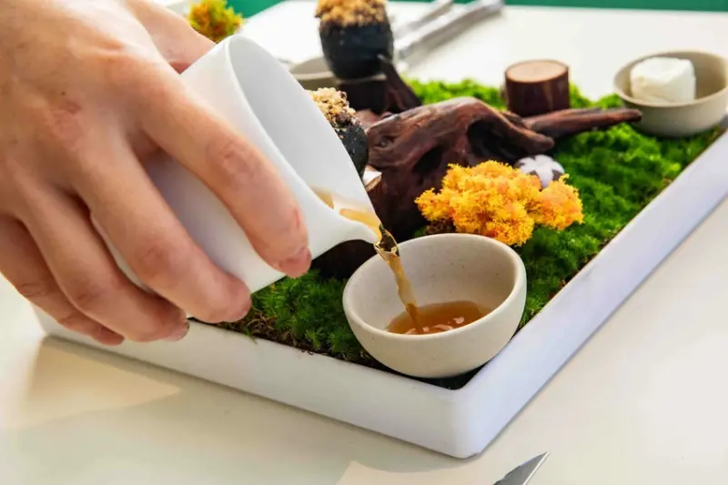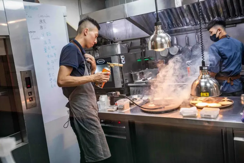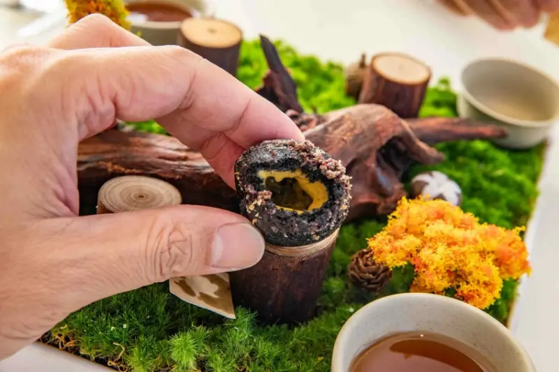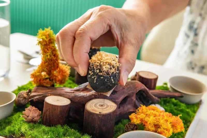 桌角會擺著四只小杯,服務生會現場倒入特製手湯,帶著柚子清香襯著桂花氣息,先溫暖地清潔雙手。隨後,顧客會以雙手品嚐迎賓小點,這種一前一後的流程充滿互動性,像在參與一場迷你的「森林儀式」。