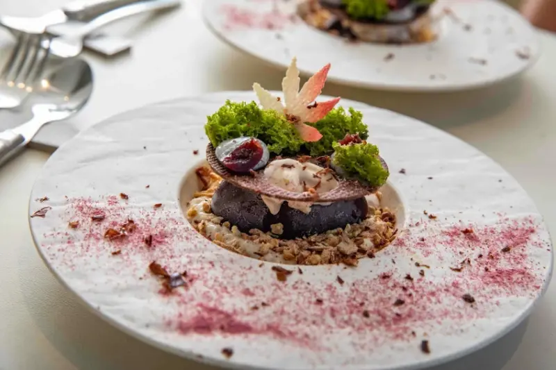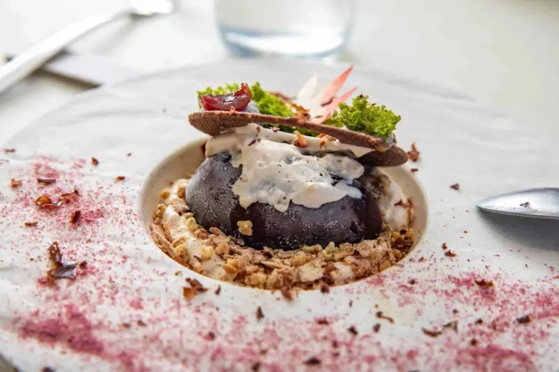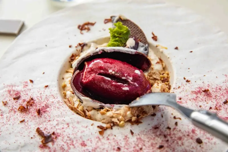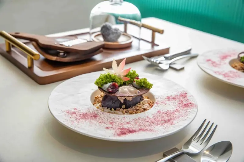 甜點像是經典黑森林的變化款。服務生會桌邊現刨松露巧克力,儀式感拉滿,香氣立刻炸開。黑櫻桃的酸潤、比利時巧克力的濃醇與松露的幽香交織。底層用奶酪搭配蕎麥增添穀香與脆度。整盤像一件可食的藝術品,視覺精巧、口感多變。