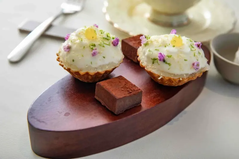 顧客還幸運招待到「白蘭地生巧克力」,一次解鎖雙重風味。這款生巧克力以豆腐為基底,拌入百分之七十的法芙娜黑巧與白蘭地,每片僅有22卡。它入口即化、酒香與可可香交疊,毫無豆腐味,輕負擔卻超滿足。另外,柚子塔將台灣文旦與日本柚子合體,塔面點綴日本進口乾燥柚皮與檸檬皮,外型細緻優雅,內餡還能吃到文旦果肉,清新酸甜。