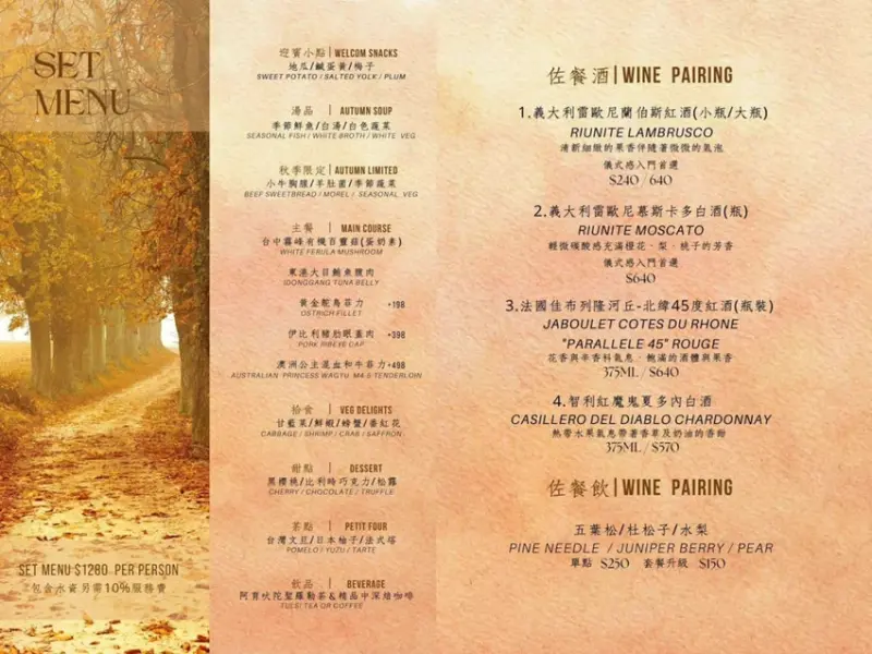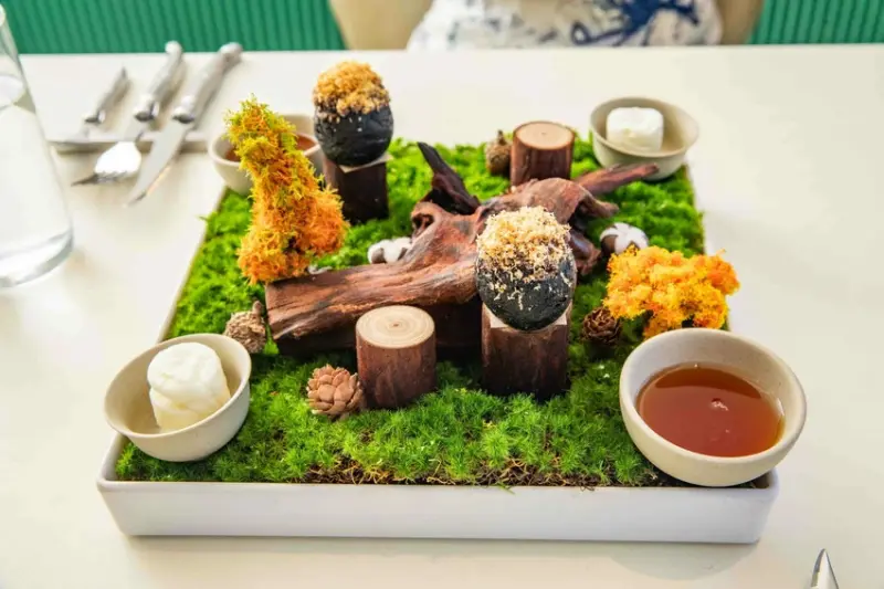 這次品嚐的是秋季限定套餐,時間是從2025年9月16日到2025年12月14日。首先送上的迎賓小點,擺盤以「森林」為題,呈現出苔綠、木質、露水的微型林景,讓視覺先被驚豔。
