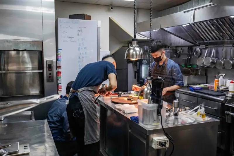這間餐廳的室內設計相當特別。一樓主要是接待櫃檯與開放式廚房的主場,最引人注目的就是那面L形落地玻璃。這片玻璃就像把舞台拉到顧客面前,讓火光、蒸氣、刀工與烹調技法等主廚的料理秀都清晰可見,可以近距離欣賞主廚的風采。