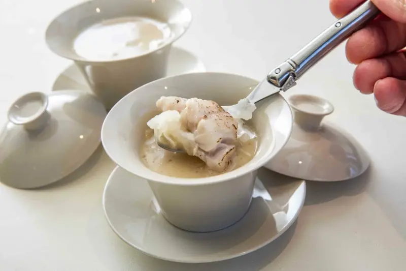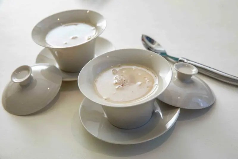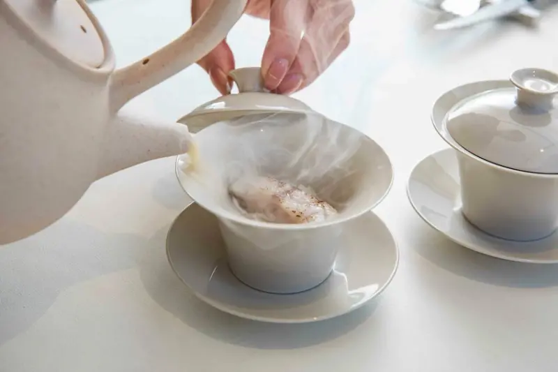 湯品上桌時儀式感十足,掀開湯盅,桃木煙燻的白霧會緩緩升起,濃湯面上點綴著細小的食用花,仙氣滿點。服務生會在桌邊注入以白木耳、百合根、豆薯花慢火熬成的高湯,湯頭質地濃潤順口。湯內有紅馬頭魚肉,口感細嫩滑潤,與一系列「白色蔬菜」相映成趣。最後再以山當歸花與花椒油勾勒香氣,層次從鼻尖一路延伸到喉間,暖、潤且帶有補意,讓人感到整個身體都被安撫了。