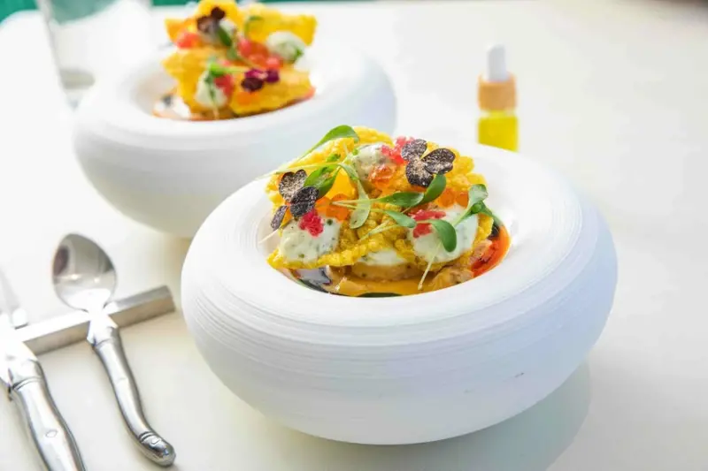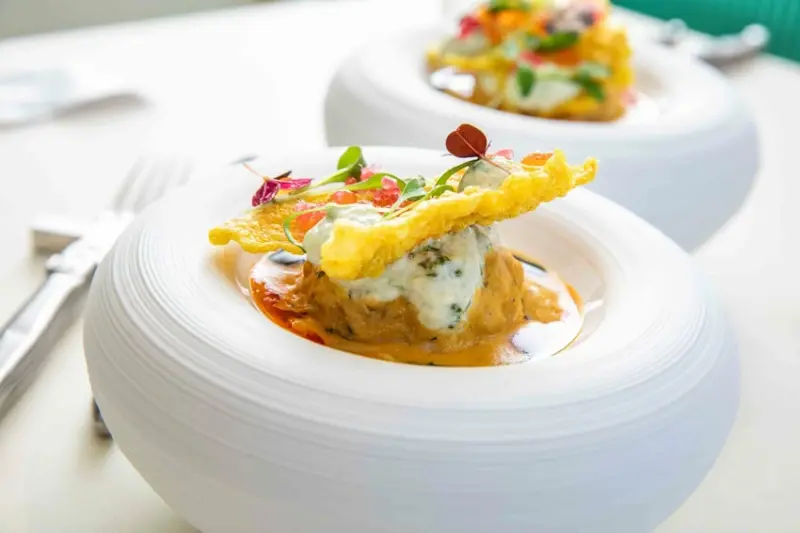 在主餐後,會送上「拾時」。器皿設計感十足,儀式感瞬間拉滿。乍看像甜點,其實是法式甘藍卷,將鮮蝦、筊白筍、玉米包進脆嫩層次。外頭再以螃蟹精華搭配番紅花醬收束,濃郁細雅,顛覆味覺想像。這道菜還會貼心附上一小瓶主廚自製檸檬葉油,吃到中段滴上幾滴,清新的葉香立刻竄起,將油脂感削薄、酸香將味型拉亮。