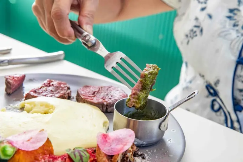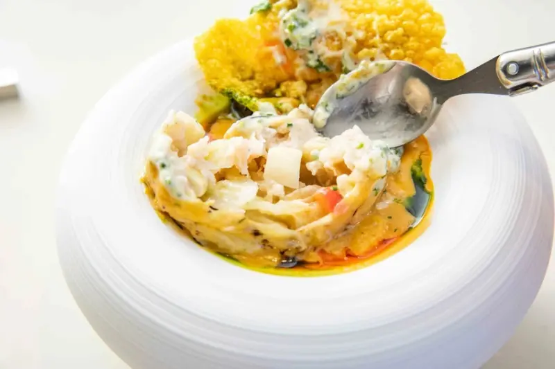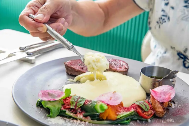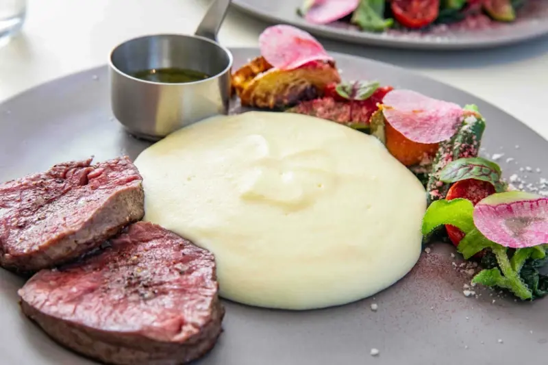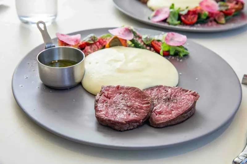 主餐提供了兩種選擇。首先是「澳洲公主混血和牛菲力佐阿根廷青醬」。和牛菲力上桌時先聞到焦香,接著看到恰到好處的焦褐色。刀一落下幾乎不費力,中心柔嫩帶彈性,像奶油般細緻在舌尖化開。旁側的阿根廷青醬以香草、蒜與醋酸為主軸,清爽辛香將和牛的甜脂拉得更立體。中間部分的馬鈴薯泥,口感像雲一樣綿密,入口先是奶油香緩緩化開,細滑到幾乎不需咀嚼。
