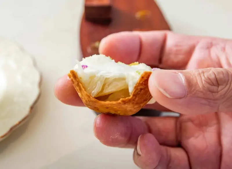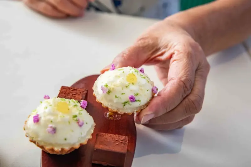 迎賓小點外層是貝涅餅裹上可可酥,一咬即裂。餅皮裡藏著鹹蛋黃搭配地瓜的流心,微施力就會爆漿。頂部再點綴一抹梅子提酸,讓脆、濃、甜鹹的口感與香氣層層接力,小小一顆卻充滿了驚喜感。