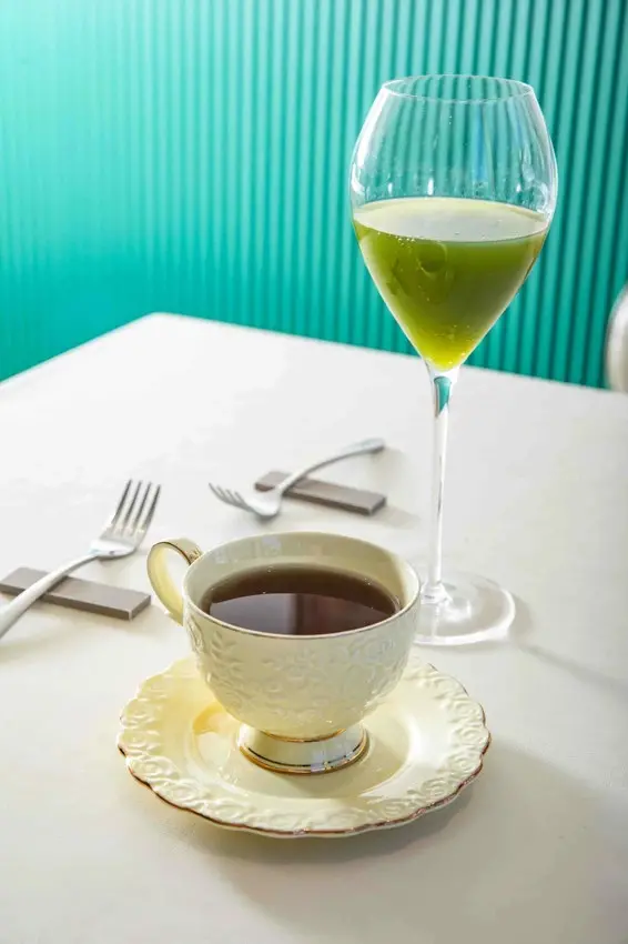 飲品點了兩款:「阿育吠陀聖羅勒茶」與「五葉松/杜松子/水梨」。聖羅勒茶熱沖後香氣溫柔而定心。另一杯是五葉松、杜松子、水梨為基底,帶著細緻果甜與草本辛香,疊上茶香檳氣泡的微微氣感,入口輕盈清爽。
