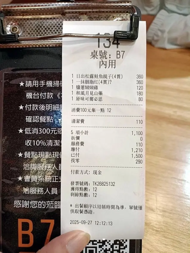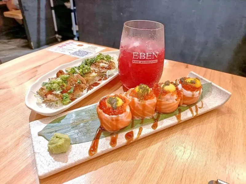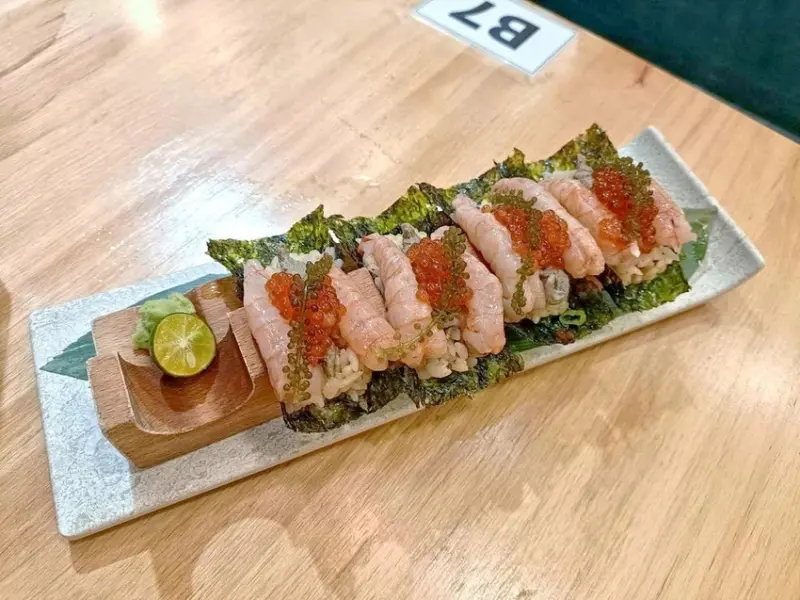 這裡的上菜速度相當快,餐點很快就擺滿桌面,「和風月見山藥」是一道清爽的開胃菜,山藥絲上鋪滿了海葡萄、生蛋黃、柴魚片和蝦卵,幾乎快看不到山藥本體,搭配底層的洋蔥與和風醬汁,攪拌均勻後入口,口感層次豐富且滑順,而店內招牌「日出松露鮭魚親子」一份4貫,肥美的鮭魚片將醋飯完整包裹,頂端再堆滿晶瑩剔透的鮭魚卵並放上一顆生蛋黃,一口塞進嘴裡,鮭魚的甜、魚卵的鮮與蛋黃的滑潤感在口中瞬間爆發,是許多饕客必點的夢幻逸品。