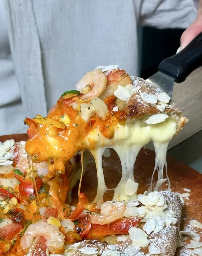 「海灣總匯芝加哥」的起司瀑布真的不要太邪惡!上面塞了滿滿的海鮮,還撒了杏仁片來增添脆感,就連餅皮邊邊也都是牽絲起司,難怪之前還在Threads上爆紅~熱量就該浪費在這種美食上啊