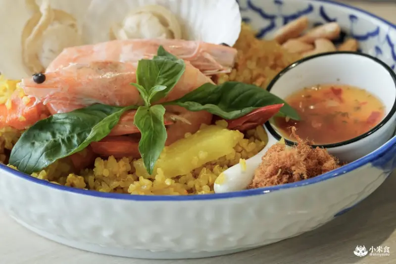 粒粒分明的泰國香米炒飯淋入酸甜開胃的特製醬汁,結合鳳梨的明亮甜香,還有孔雀蛤與蝦蝦來站台,一道清爽不油膩的主食