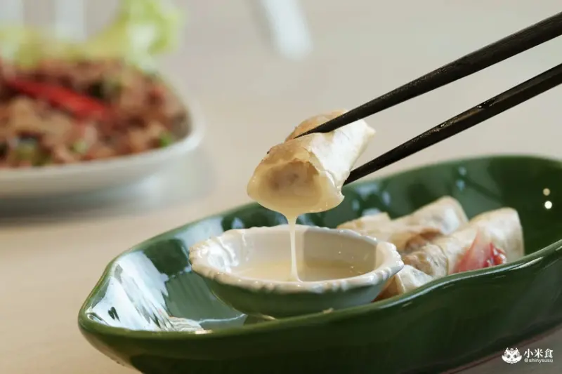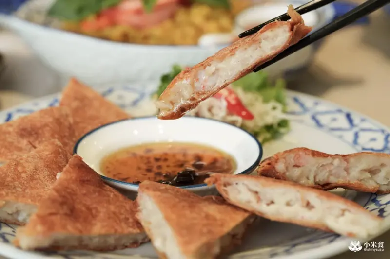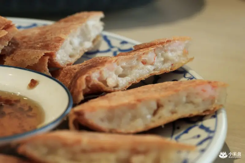 蝦肉混入花枝漿和魚漿來增添鮮美,蝦餅大塊厚實且皮脆酥、餡Q彈,佐酸v甜美的自製梅香醬汁,唰嘴極了!米一個人可以嗑一盤~