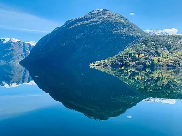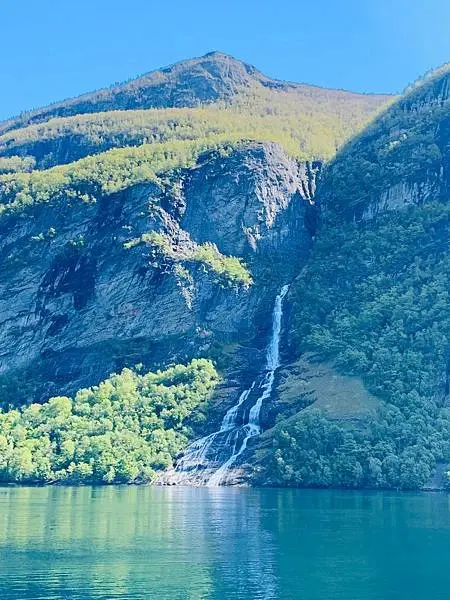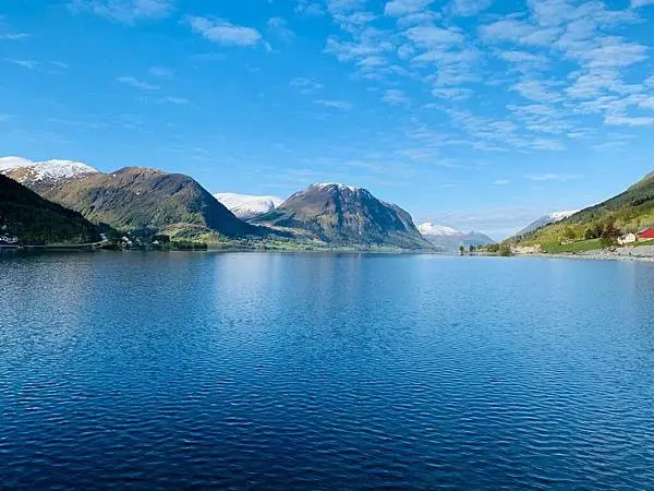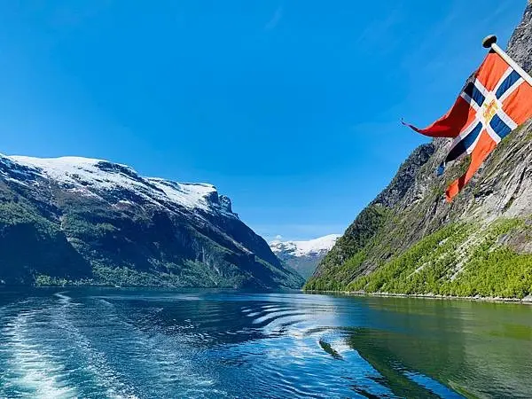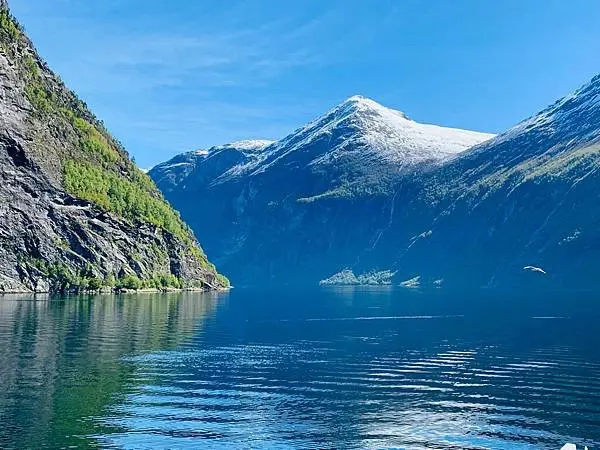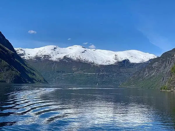 後記:遊納柔依峽灣Nærøyfjord時是很興奮的,期待已久的峽灣終於在眼前出現。在遊第二個峽灣蓋格倫峽灣Geirangerfjord,雖然周圍很多人有其他同船的旅客,心情卻出奇的平靜!也發覺開始時大家都很興奮一直的在忙拍照,慢慢的,大家都靜心下來了,就在船上找了個位置坐下休息好好的在欣賞享受著這兩小時的寧靜,船前進着風冷冷的吹來大太陽照射下藍藍的天空,這當下感覺就是自然的讓人感受這大自然帶來的放鬆。