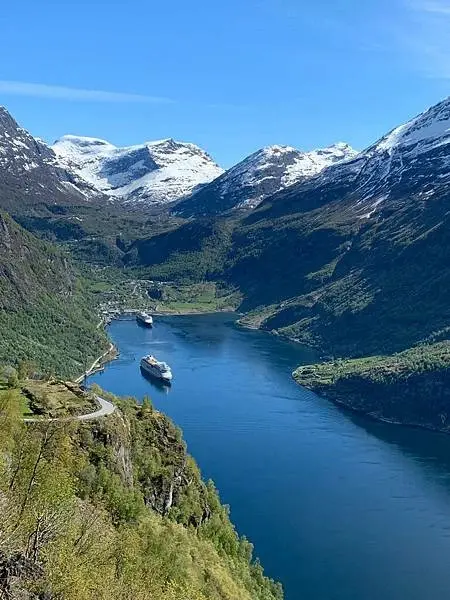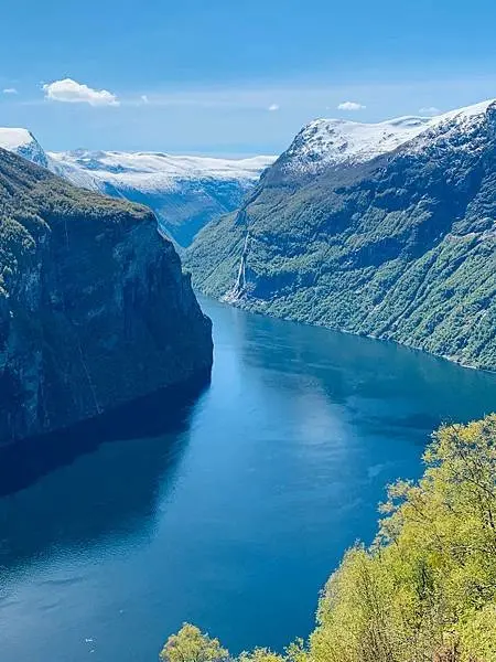 蓋格倫峽灣Geirangerfjord,全長長達15公里。峽灣的源頭坐落着小村莊蓋朗厄爾。峽灣沿岸環繞着白雪覆蓋的宏偉山峰、有垂直在山坡浩浩盪奔騰而下廣爲人七姐妹瀑布(De syv søstrene)以及綠色繁茂的樹木,天氣好的時候是山水相輝映藍天白雲。