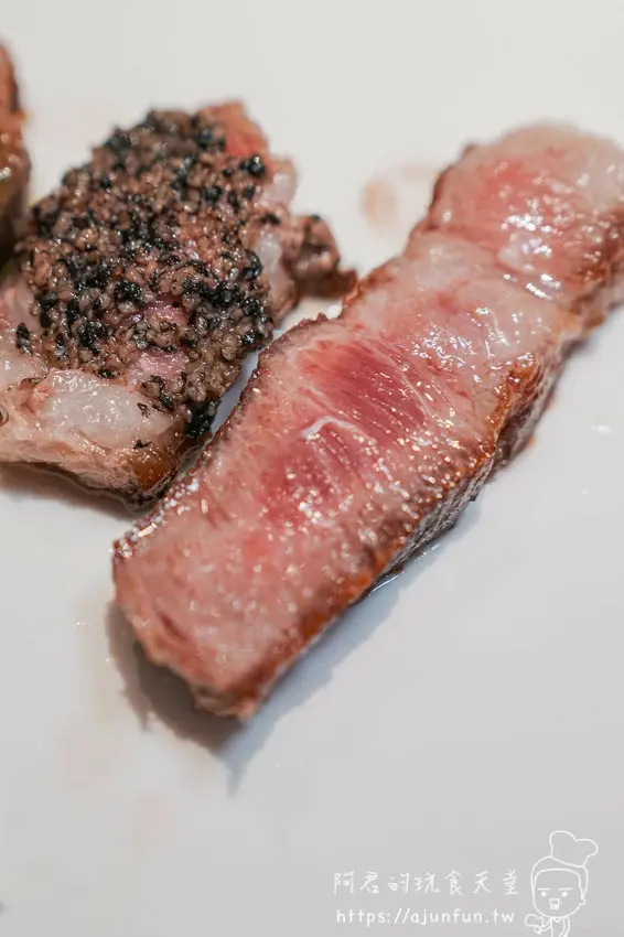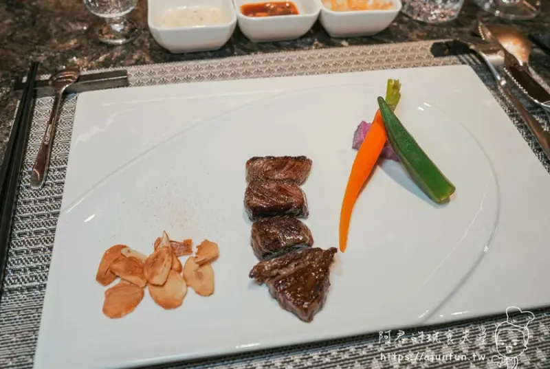 - 美國無骨牛小排: 主廚自信地推薦我們吃「全熟」。我心想全熟的牛排能好吃到哪去?結果一吃,我錯了。外層焦香酥脆,裡面卻是滿滿的肉汁,牛肉的香氣在口中爆炸。搭配蒜片、洋蔥,每一口都有不同感受。
