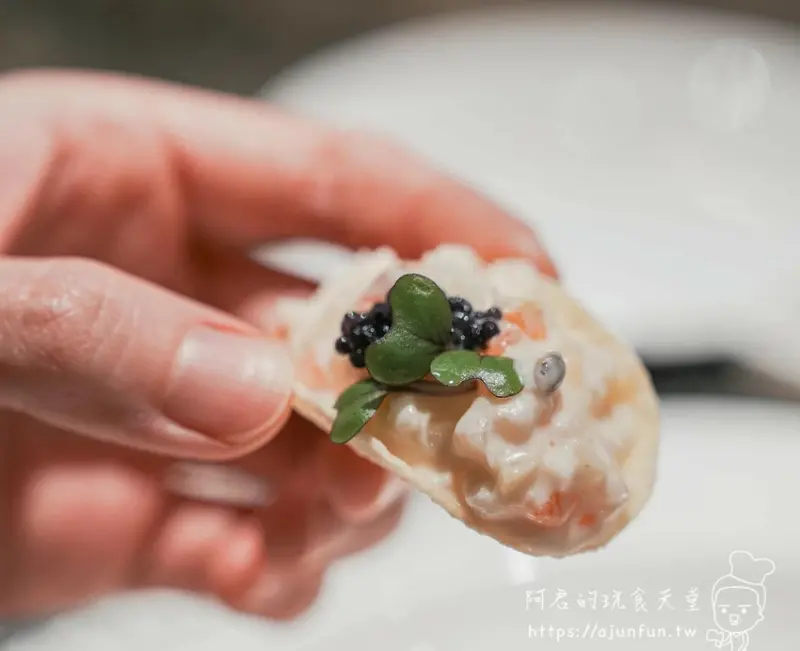 - 開胃前菜 – 燻鮭魚佐時令鮮果洋芋片: 這道菜完全顛覆你對「前菜」的想像。底下是香脆的洋芋片,上面疊著軟嫩的燻鮭魚、清甜的梨與蘋果,最上方再點綴黑魚子醬。一口咬下,脆、軟、甜、鹹各種滋味在嘴裡爆發,非常清爽。