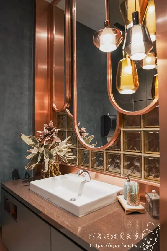 主色調是沉穩的灰色系,但大量運用的玫瑰金/古銅色金屬元素,從天花板、酒櫃到門框,無所不在,讓整個空間瞬間奢華了起來。