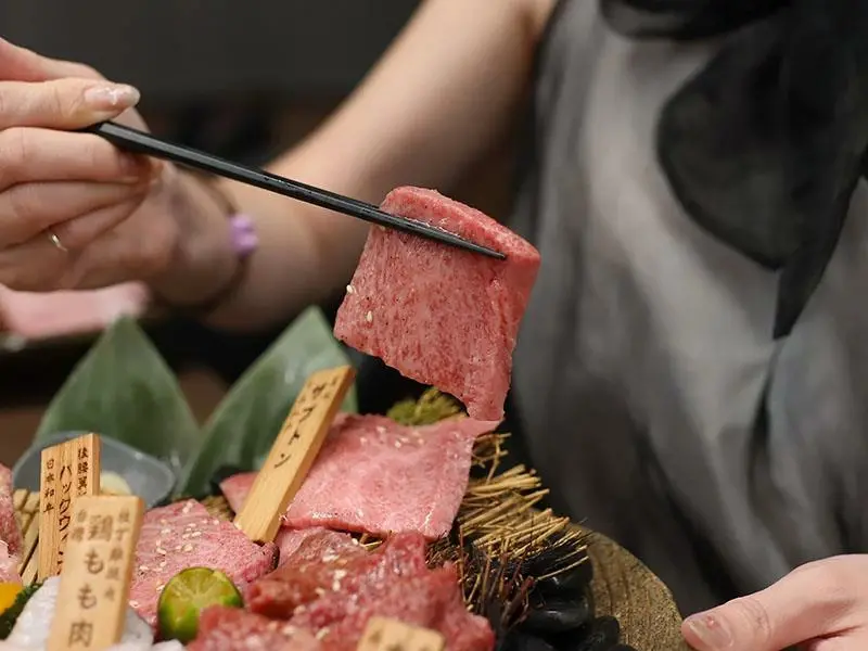 餐廳採套餐搭配單點的模式,不吃牛肉的顧客有非牛盛合可選,但內行饕客首選推薦的還是「和牛盛合套餐」,每人1680元就能品嚐到高檔日本與澳洲和牛,套餐一開始就展現滿滿儀式感,提供了三種精緻漬物,包含韓式泡菜、辣味噌小黃瓜與柚子蘿蔔,湯品也非一般的雞白湯,而是使用日式醬油與蔬果熬煮的熱湯,接著是「燻鴨胸胡椒和風沙拉」,薄切燻鴨胸搭配新鮮蔬果,口感清爽不膩。