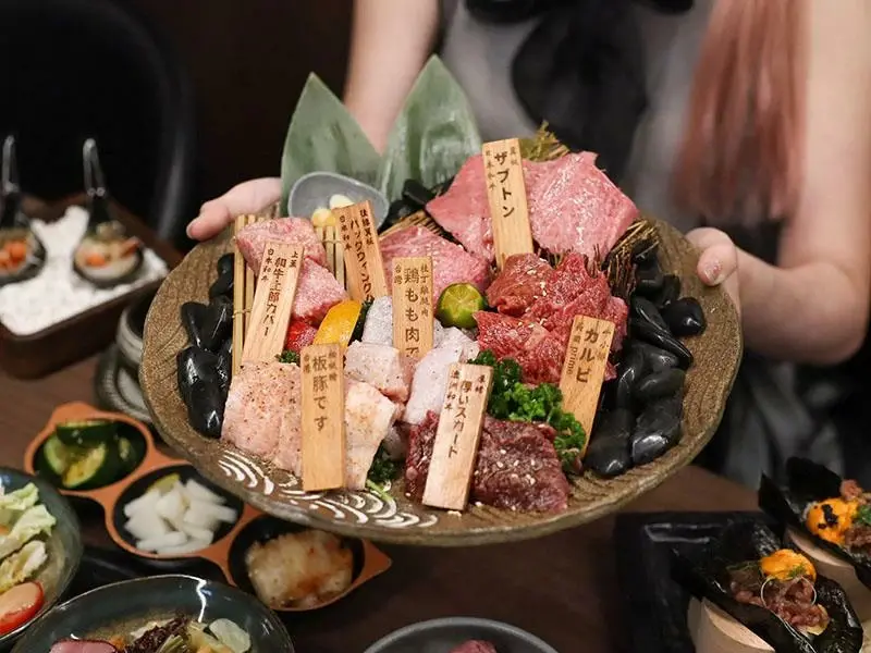 店內空間分為1樓與2樓,環境寬敞舒適,採用時尚的現代光感設計,並巧妙融合了清酒、福壽酒樽與關東旗等日式元素,營造出餐酒館的氛圍,座位主要為4人桌與6人桌,在微黃的燈光下享用頂級燒肉,讓聚餐體驗更具情調。