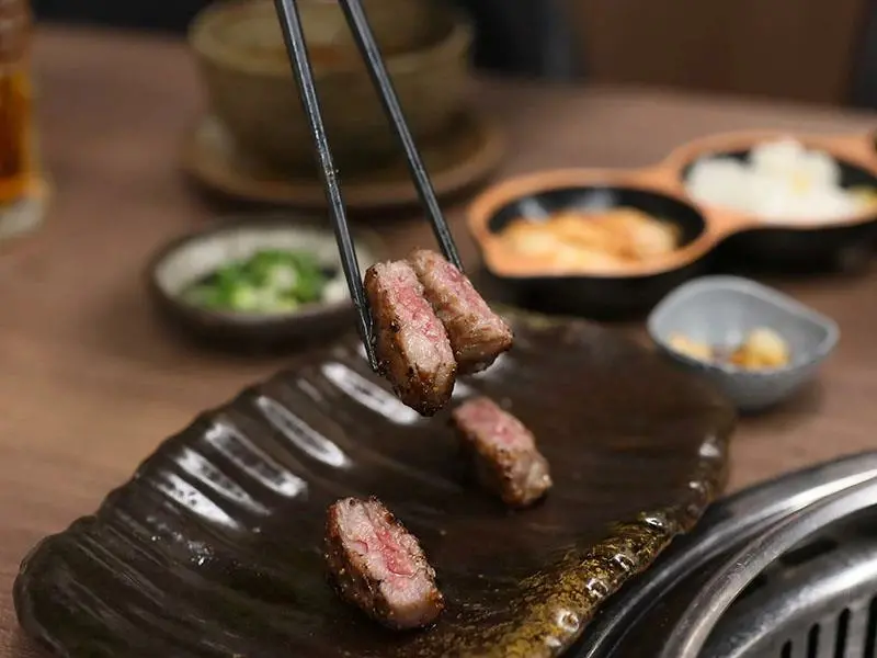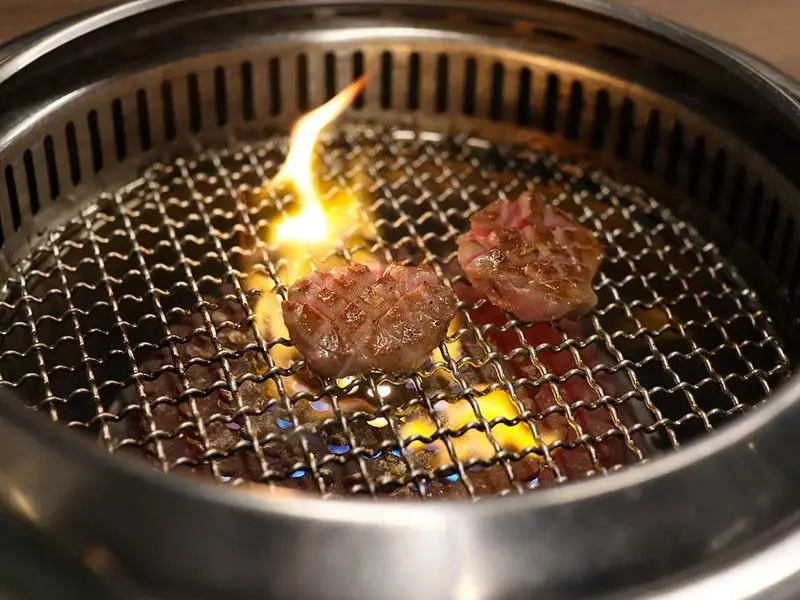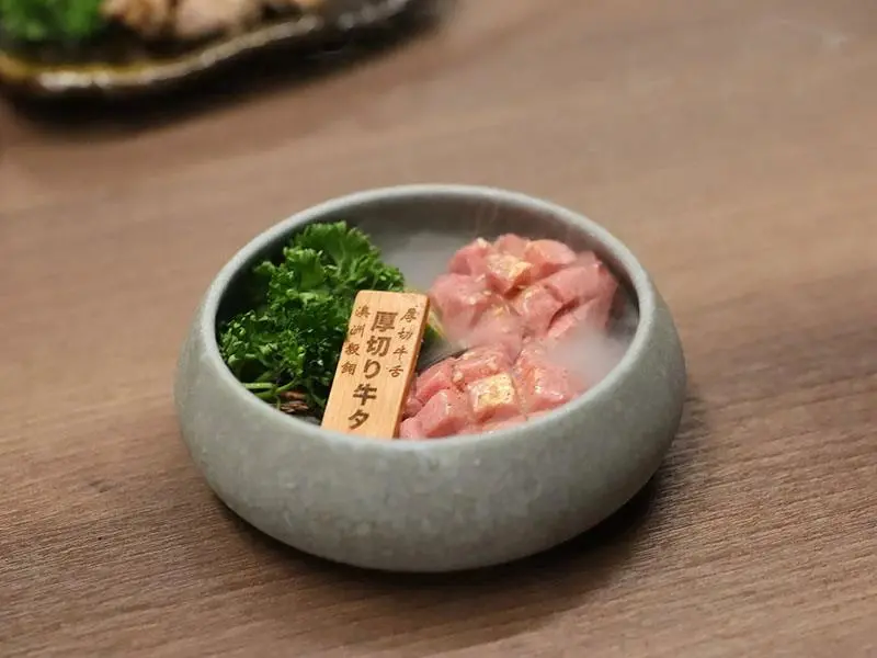 除了套餐內容,許多饕客也會額外加點「厚切牛舌」,一份售價660元,兩塊上桌的牛舌刻上了龜甲紋路,份量感十足,由專人烤至表面微焦,入口瞬間感受到外層的香脆,接著是牛舌特有的彈牙嚼勁,搭配店家特製的檸檬蔥鹽,牛脂香氣越嚼越回甘。