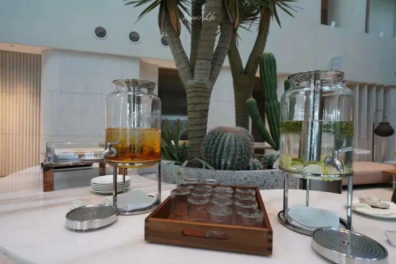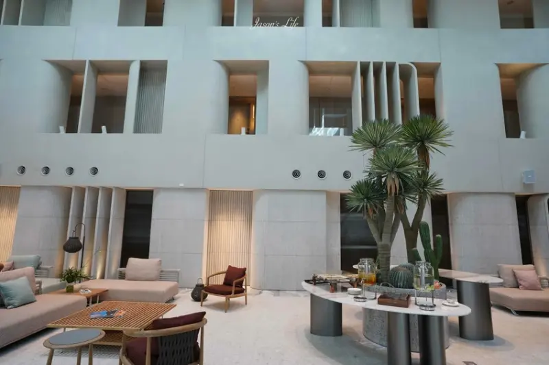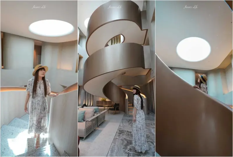 飯店的名稱「dùa」源自閩南語的「住」,傳達了希望旅客能徹底放鬆的品牌精神,墾丁館的設計靈感來自珊瑚與貝殼,一走進挑高的一樓大廳,就能感受到自然光線穿透天井,營造出如海面波光粼粼的氛圍,大廳最吸睛的焦點,無疑是那座以貝殼螺旋為靈感的巨大旋轉樓梯,已成為熱門打卡景點,值得一提的是,飯店更是全亞洲第一家在全公共區域使用義大利百年家具品牌「Poltrona frau」的度假飯店,展現其對奢華品味的極致追求,到了夜晚,大廳燈光變換成海洋藍色,呼應著對環境永續的理念,飯店也全天候提供迎賓飲料與零食,讓旅客一入住就能感受到貼心服務。