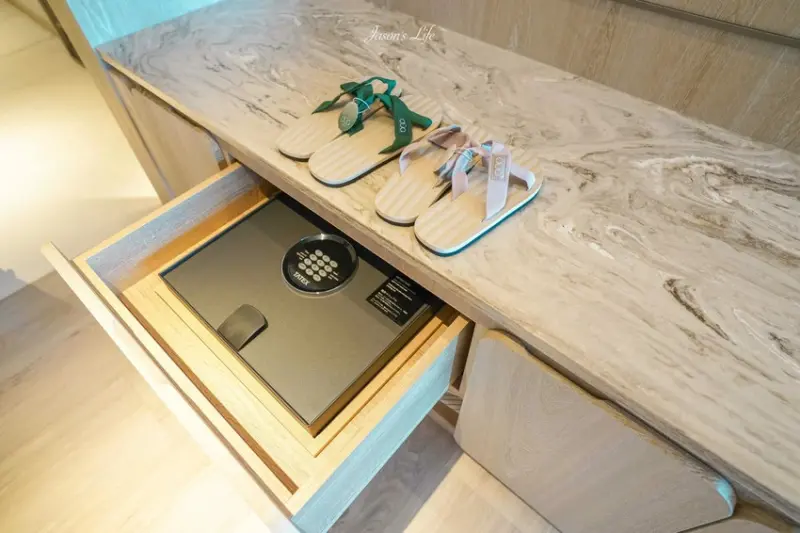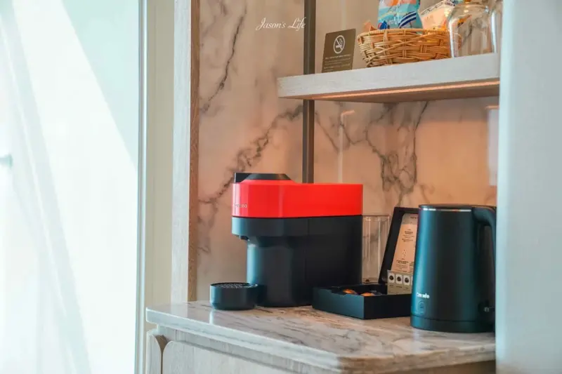 此次開箱的「行政客房」擁有15坪的寬敞空間,延續了品牌一貫的低調奢華風格,採用溫暖的木質調與柔和燈光,營造出寧靜的休憩氛圍,客房內配置了知名的「斯林百蘭」雙人床,確保高品質的睡眠體驗,床邊還提供了「BOSE」藍芽喇叭,房內設有小客廳沙發區,以及可以欣賞墾丁夕陽與海景的陽台,最讓旅客驚喜的是,Mini Bar提供的飲料、膠囊咖啡、聯名乖乖零食與能量飲料,全部都是免費享用,浴室空間也毫不馬虎,採乾濕分離設計,並配備了雙洗手台與獨立的蛋型浴缸,讓度假的舒適感大幅提升。