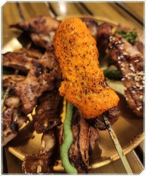 對於初次造訪的顧客,店家極力推薦的「雞八盛合」是必點的品項,這個組合一次包含了8串雞肉串燒,讓顧客可以一次吃到多樣的職人級炭火燒鳥,其中包含了明太子雞腿串、雞胸軟骨串、雞翅包飯、蔥鹽雞腿串以及哇沙米雞腿串等,每一串都展現了燒烤師傅高超的烤功,讓人一口接一口停不下來,例如「明太子雞腿串」是許多人偏愛的口味,雞腿肉烤製後,裹上了一層鹹甜風味的明太子醬,濃郁且極具特色,而「雞胸軟骨串」則以越啃越香的口感取勝,帶有鹹香且滿口蔥香的「蔥鹽雞腿串」也很受歡迎,另外「雞翅包飯」則是以香氣逼人的雞翅包裹著米飯,讓人一口咬下獲得大大的滿足。