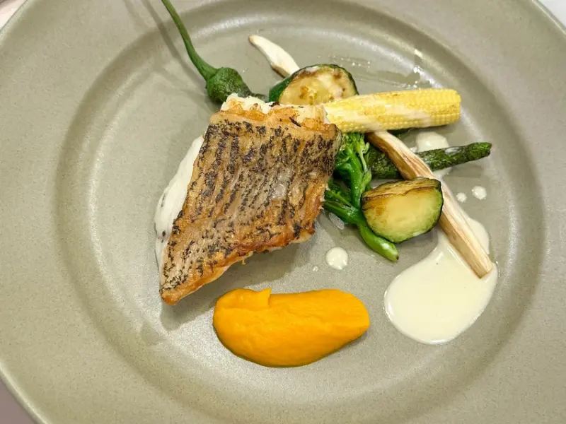 大塊的石斑魚肉魚皮煎到金黃酥脆,內層魚肉細緻又鮮嫩多汁,搭配一旁蔬菜和帶有甜味的蘿蔔泥,瞬間完食