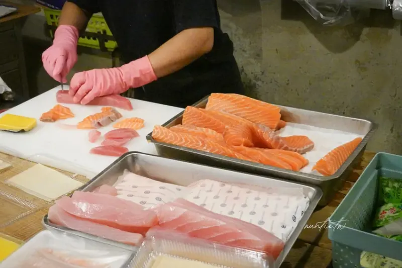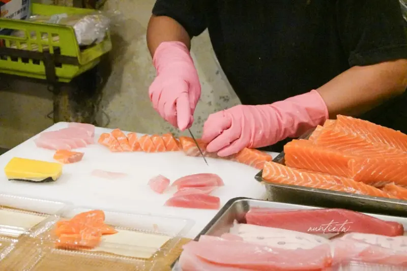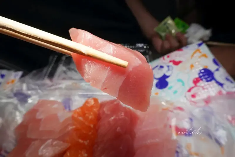 實際在連假期間的半夜造訪,排隊人潮真的超乎想像,現場大概有3家生魚片店家,其中中間的攤位據說人氣最旺,需要先拿號碼牌,排隊人龍更已轉了好幾圈,由於不想花費太多時間等待,因此這次選擇了隊伍最短、位於門口地板也相對乾爽的第1家攤商,這家店同樣是現點現切,作業流程一目了然。