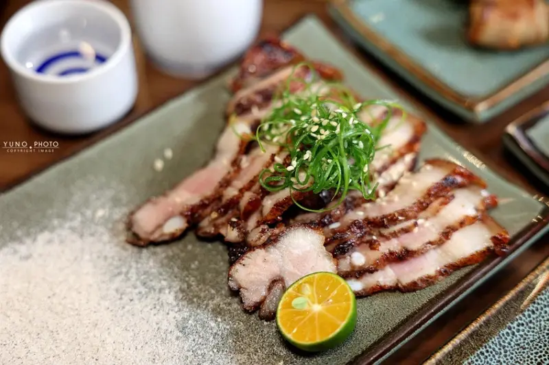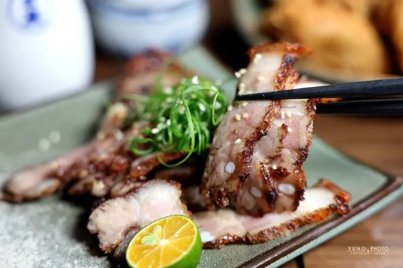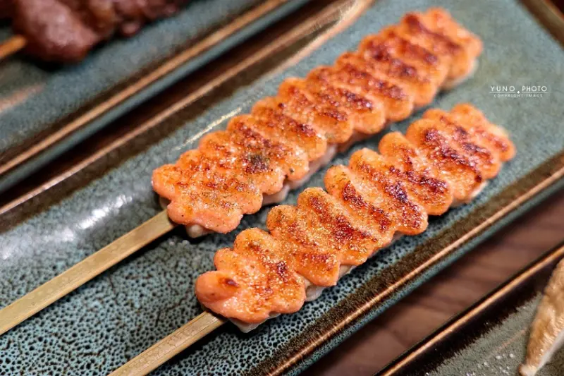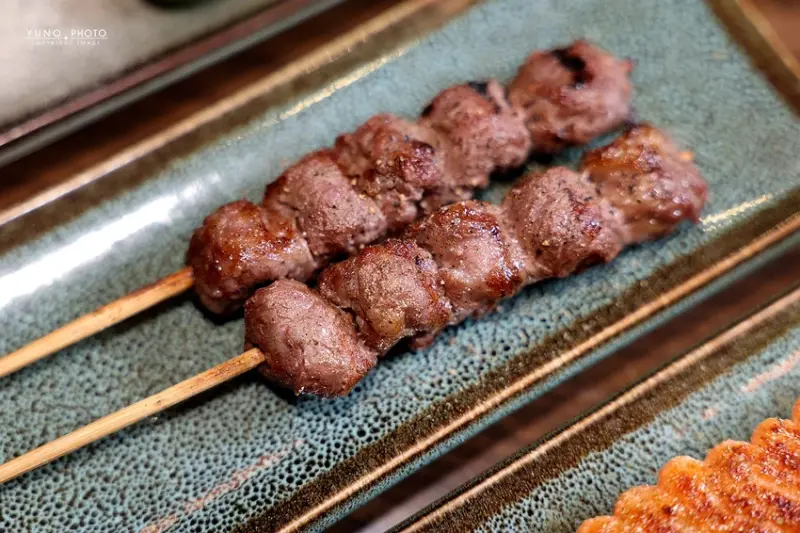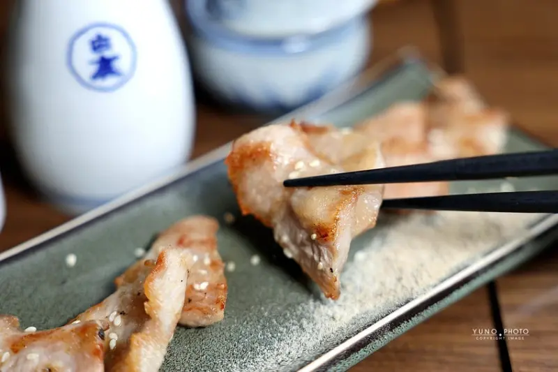 來到「老味噌」,主角當然就是那一串串現點現烤、香氣四溢的串燒,這裡的菜單選擇非常豐富,而師傅對於火候的掌握更是精準到位,一份190元的「極上黑牛肋條」,以簡單的鹽烤方式呈現,外層帶著迷人的焦香,內裡卻依然軟嫩多汁,牛肉風味十足,而一份180元的「絕代花椒豬」,則是將薄切的豬五花烤得邊緣酥脆,撒上特製花椒粉、蔥絲與芝麻,香麻夠味,擠上一點金桔汁更是清爽解膩,另外,鋪滿明太子的「明太子雞肉串」,一份160元,用料大方、鹹香濃郁,也是店內居高不下的人氣品項,同樣不容錯過的還有經典的「鹽烤松板豬」,一份150元,烤得外脆內彈牙,簡單調味就很美味,以及口感獨特的「椒鹽雞軟骨」,一份140元,香酥脆口超下酒。