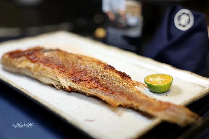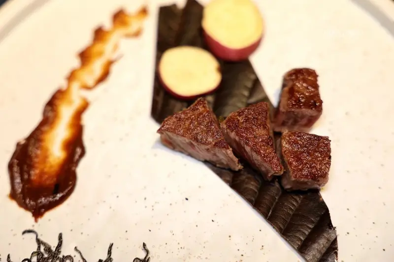 在肉品方面,日本A5和牛絕對是整場鐵板燒饗宴的壓軸亮點之一,主廚特別選用來自日本的 A5 等級和牛,如果是選擇2400元的套餐,更是能吃到油花分布最均勻、口感最柔嫩的菲力或老饕部位,烹調的過程極度講究,主廚會先以鐵板高溫封住肉汁,再靜置回溫讓肉質熟成回甜,最後再次煎烤至表面金黃微酥,散發誘人的牛香,入口時,先感受到外層的微脆,接著是柔嫩多汁的粉紅肉芯,每一口都帶有和牛特有的甘甜油脂香氣,濃郁卻不膩口,另外,即使是點1600元的套餐,也可以選擇台灣的驕傲「桂丁雞」,這種有國宴雞之稱的高級土雞品種,肉質扎實卻不柴,油脂分布均勻,主廚會以鐵板慢火將雞皮煎到金黃酥脆,肉質鮮嫩多汁,香氣完美釋放,對於不吃牛或想換換口味的饕客來說,是物超所值的必點主菜。