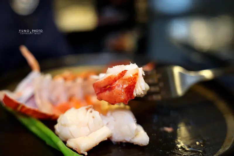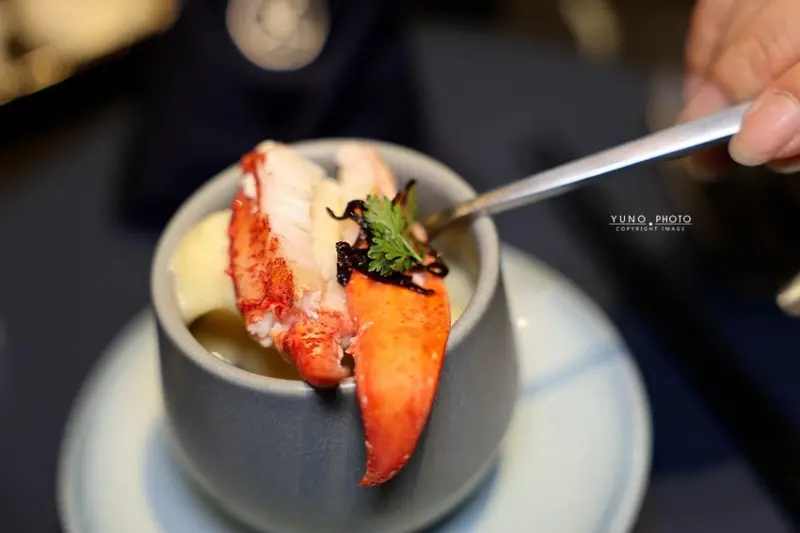 明水然,樂最經典的招牌就是龍蝦三吃,將一隻活體波士頓龍蝦的美味發揮到淋漓盡致,這場龍蝦之旅從「波士頓前螯龍蝦蒸蛋」開始,這是龍蝦三吃的第一道,嫩滑的蒸蛋像布丁般綿密,上方的龍蝦螯肉飽滿又鮮甜,加上昆布鹽提味,讓龍蝦的海味更加突出,吃起來溫潤又奢華,接著第二吃是「清蒸龍蝦」,以最單純的烹調方式,讓顧客吃到龍蝦本身的鮮甜與Q彈口感,絕對是一道讓人記憶深刻的精緻料理,最後的第三吃是「起司龍蝦頭佐帕瑪森起司X海膽醬」,龍蝦頭加入了濃郁的帕瑪森起司與特製海膽醬進行焗烤,香氣超級迷人,外層微焦帶脆,裡面則保有龍蝦膏的濃厚鮮味,是視覺與味覺的雙重轟炸。