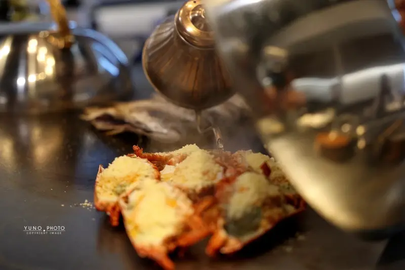 這間高CP值的無菜單鐵板燒,將新鮮度這項標準拉到了最高規格,在等候區,一定會看到一個活體海鮮水族箱,水族箱裡的波士頓活龍蝦都活跳跳,充滿活力,這些龍蝦都是現撈上桌,新鮮度完全不用懷疑,等到牠們被送到鐵板上時,甚至還能看到牠們微微收縮的姿態,讓人對即將上桌的美味充滿期待,店內採用經典的板前座席設計,讓每一位顧客都能近距離欣賞主廚的料理過程,從活龍蝦現場下鍋,到A5和牛的精準煎烤,食材在鐵板上滋滋作響,香氣四溢,每一個瞬間都是視覺與嗅覺的豪華饗宴,尤其店家特別喜歡這種一邊欣賞料理秀,一邊期待下一道菜的過程,既放鬆又充滿驚喜。