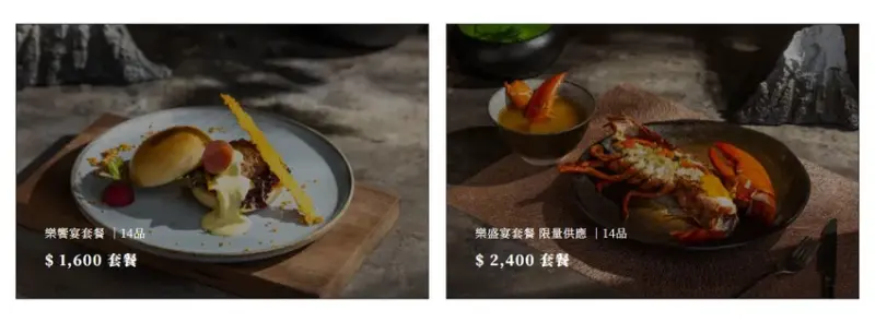 1,樂饗宴套餐 價格1600元外加10%服務費,總共14道品項,包含加拿大活龍蝦、日本 A4 或 A5 和牛或頂級桂丁雞,以及當令新鮮現流魚、時蔬、甜點等。