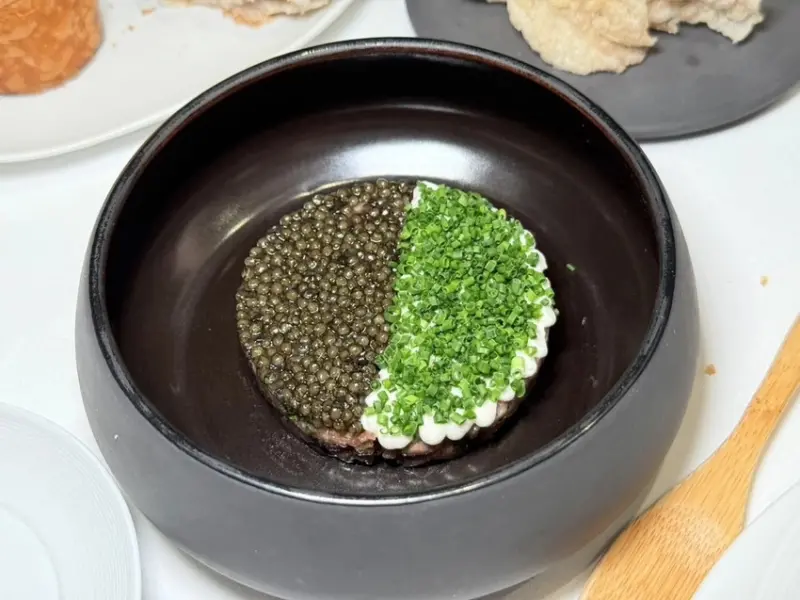 除了頂級牛排之外,A CUT的高級海鮮與精緻前菜也同樣值得品味,餐廳限量供應從法國新鮮空運來台的「新鮮生蠔」,飽滿鮮甜無腥味,可搭配香檳醋或雞尾酒醋來增添風味,如果想在主菜之外享用龍蝦,顧客只需要加價800元,就可以品嚐到「加拿大HPP生凍波士頓螯龍蝦」,雖然個頭不大,但肉質緊實鮮甜,口感極佳,建議搭配法式芥末醬油,能更突顯其鮮味,在套餐中,也可以加價升級「松葉蟹與魚子醬」,選用頂級魚子醬,味道鮮美且富有層次,尾韻還帶有獨特的花香,另外,「炙烤澳洲和牛牛舌」也相當受歡迎,牛舌經過低溫燉煮後再炙燒,口感外酥內韌。